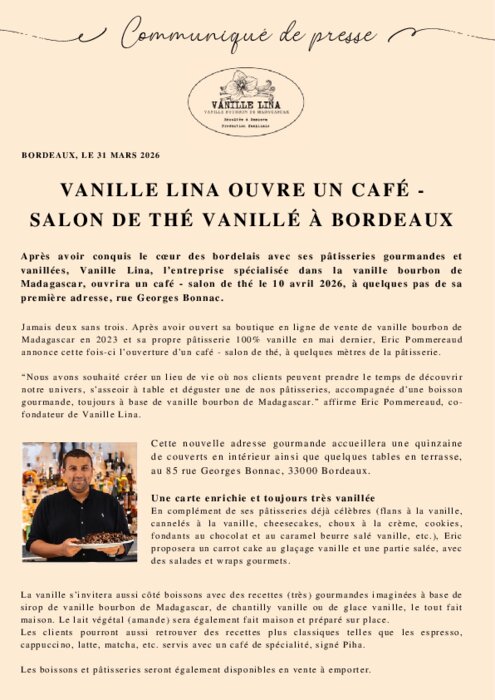 Après avoir conquis le coeur des Bordelais avec ses pâtisseries gourmandes et vanillées, Vanille Lina, l'entreprise spécialisée dans la vanille bourbon de Madagascar, ouvrira un café et salon de thé le 10 avril, à quelques pas de sa première adresse, rue Georges Bonnac.