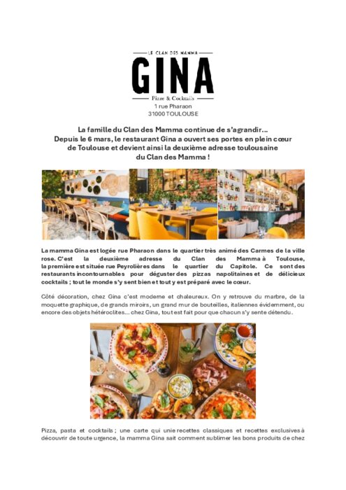 La mamma Gina est logée rue Pharaon dans le quartier très animé des Carmes de la ville rose. C’est la deuxième adresse du Clan des Mamma à Toulouse, la première est située rue Peyrolières dans le quartier du Capitole. Ce sont des restaurants incontournables pour déguster des pizzas napolitaines et de délicieux cocktails ; tout le monde s’y sent bien et tout y est préparé avec le cœur.