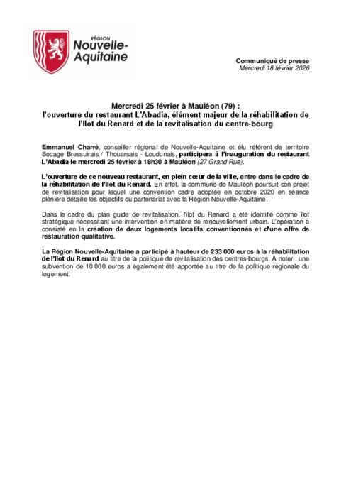 Emmanuel Charré, conseiller régional de Nouvelle-Aquitaine et élu référent de territoire Bocage Bressuirais / Thouarsais - Loudunais, participera à l’inauguration du restaurant L’Abadia le mercredi 25 février à 18h30 à Mauléon (27 Grand Rue).