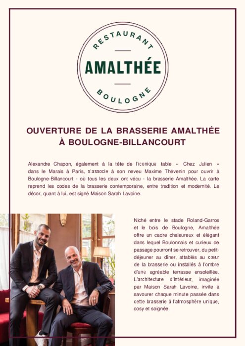 Alexandre Chapon, également à la tête de l’iconique table « Chez Julien » dans le Marais à Paris, s’associe à son neveu Maxime Thévenin pour ouvrir à Boulogne-Billancourt - où tous les deux ont vécu - la brasserie Amalthée en mai. La carte reprend les codes de la brasserie contemporaine, entre tradition et modernité. Le décor, quant à lui, est signé Maison Sarah Lavoine.