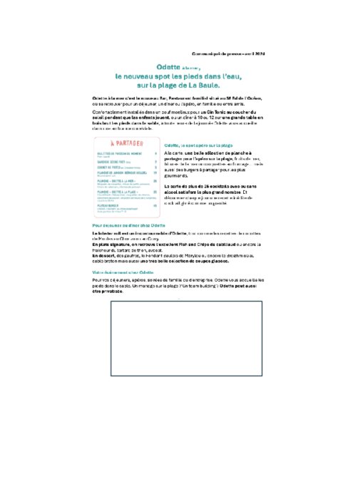 A la carte, une belle sélection de planche à partager pour l’apéro sur la plage : fruits de mer, fritures de la mer ou croquettes au fromage... Pour accompagner ces planches, Odette propose une large carte de cocktails avec ou sans alcool, et même un cocktail givré inédit chaque jour.