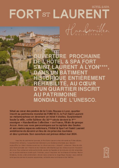 Situé au cœur des pentes de la Croix-Rousse à Lyon, quartier inscrit au patrimoine mondial de l’UNESCO, le Fort Saint Laurent se métamorphose en devenant un hôtel 4 étoiles. Surplombant toute la ville, cette bâtisse du 16ème siècle devient la 4ème enseigne « Handwritten Collection » en France, filiale du groupe Accor. Avec ses vues panoramiques sur la capitale des Gaules et ses vastes espaces extérieurs, l’Hôtel et Spa Fort Saint Laurent ambitionne de devenir un lieu de vie prisé des touristes et des Lyonnais. Son ouverture est prévue début mai 2024.