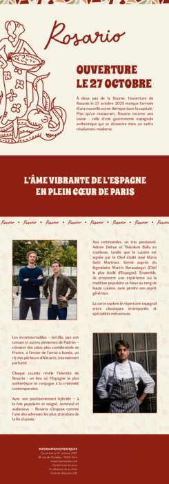 À deux pas de la Bourse, l’ouverture de Rosario le 27 octobre marque l’arrivée d’une nouvelle scène ibérique dans la capitale. Plus qu’un restaurant, Rosario incarne une vision : celle d’une gastronomie espagnole authentique qui se réinvente dans un cadre résolument moderne.