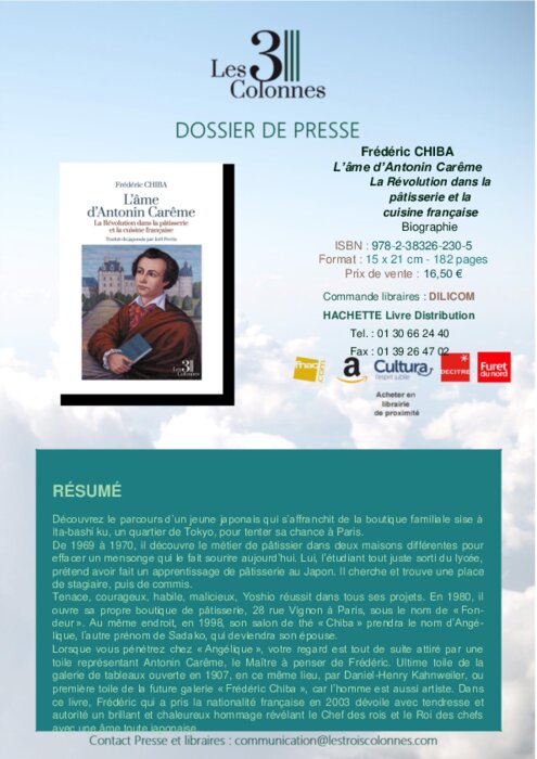 Métiers 21 mars 2022 - 11:41 C’est en 2018 que Frédéric Chiba se révèle au public français avec un premier ouvrage Un Japonais devenu pâtissier parisien. PDF (386 Ko) Télécharger