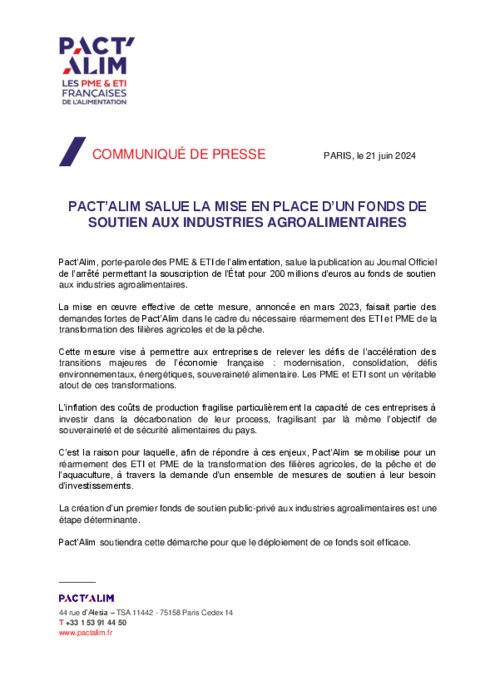 Pact’Alim, porte-parole des PME et ETI de l’alimentation, salue la publication au Journal Officiel de l’arrêté permettant la souscription de l’État pour 200 millions d’euros au fonds de soutien aux industries agroalimentaires. La mise en œuvre effective de cette mesure, annoncée en mars 2023, faisait partie des demandes fortes de Pact’Alim dans le cadre du nécessaire réarmement des ETI et PME de la transformation des filières agricoles et de la pêche.