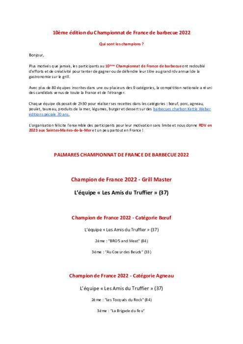 Métiers 11 septembre 2022 - 21:20 Plus motivés que jamais, les participants au 10ème Championnat de France de barbecue ont redoublé d’efforts et de créativité pour tenter de gagner ou de défendre leur titre au grand rdv annuel de la gastronomie sur le grill. PDF (130 Ko) Télécharger