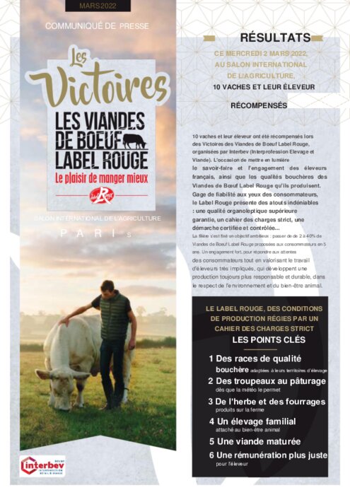 10 vaches et leur éleveur ont été récompensés lors des Victoires des Viandes de Bœuf Label Rouge, organisées par Interbev (Interprofession Elevage et Viande). L’occasion de mettre en lumière le savoir-faire et l’engagement des éleveurs français, ainsi que les qualités bouchères des Viandes de Bœuf Label Rouge qu’ils produisent.