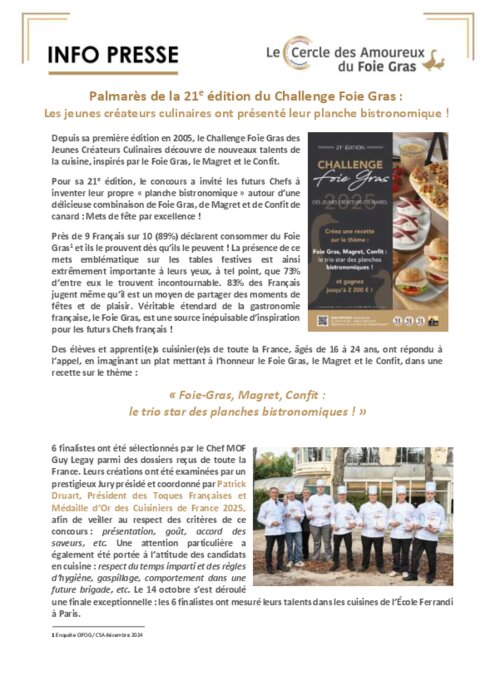 Depuis sa première édition en 2005, le Challenge Foie Gras des Jeunes Créateurs Culinaires découvre de nouveaux talents de la cuisine, inspirés par le foie gras, le magret et le confit.