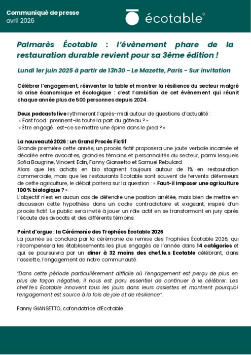 Métiers 23 avril 2026 - 12:39 Célébrer l’engagement, réinventer la table et montrer la résilience du secteur malgré la crise économique et écologique : c’est l’ambition de cet évènement qui réunit chaque année plus de 500 personnes depuis 2024. PDF (79 Ko) Télécharger