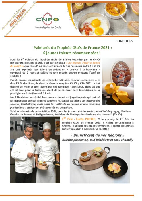 Pour la 6e édition du Trophée Œufs de France organisé par le CNPO (Interprofession des œufs), c'est sur le thème « Au Brunch, l'œuf te donne du punch » que plus d'une cinquantaine de futurs cuisiniers entre 16 et 25 ans ont exprimés leur talent en créant un « brunch à la française » composé de 2 recettes salées et une recette sucrée mettant l'œuf en vedette.