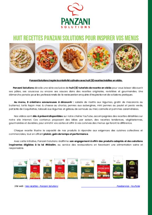 Panzani Solutions dévoile une série exclusive de huit tutoriels de recette en vidéo pour laisser découvrir ses pâtes, ses couscous ou encore ses sauces dans des recettes originales, revisitées et gourmandes. Une démarche pensée pour les professionnels de la restauration en quête d’inspiration et de solutions pratiques.