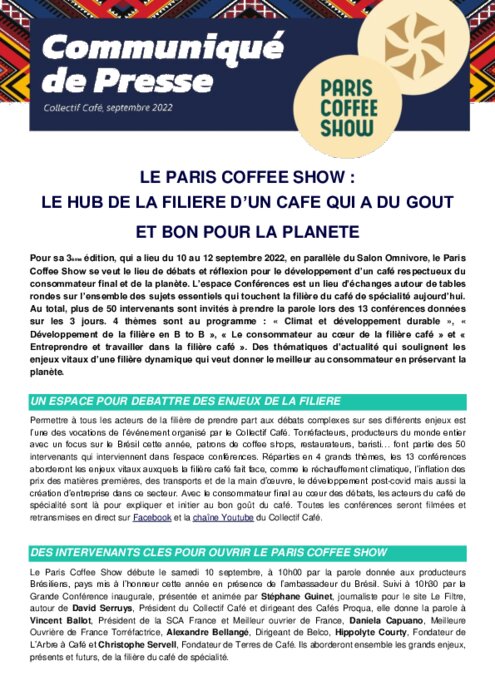 Métiers 05 septembre 2022 - 14:15 Pour sa 3ème édition, du 10 au 12 septembre au Parc Floral de Vincennes, le Paris Coffee Show se veut le lieu de débats et réflexion pour le développement d’un café respectueux du consommateur final et de la planète. PDF (408 Ko) Télécharger