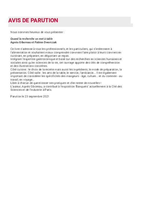 Métiers 06 décembre 2021 - 11:57 Ce livre s’adresse à tous les professionnels, et les particuliers, qui s’intéressent à l'alimentation et souhaitent mieux comprendre comment faire plaisir à leurs convives en cuisinant, en préparant, en dégustant un repas. PDF (68 Ko) Télécharger
