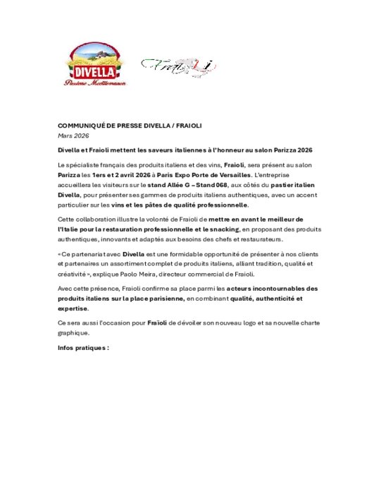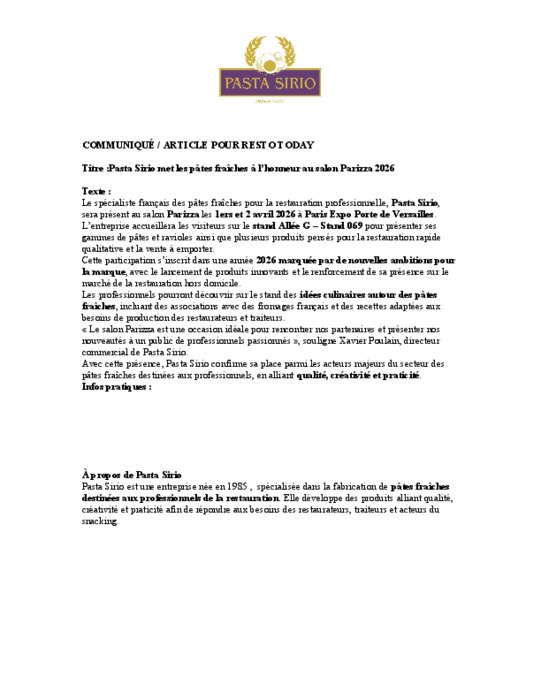 Le spécialiste français des pâtes fraîches pour la restauration professionnelle, Pasta Sirio, sera présent au salon Parizza le 1er et 2 avril à Paris Expo Porte de Versailles. L’entreprise accueillera les visiteurs sur le stand Allée G – Stand 069 pour présenter ses gammes de pâtes et ravioles ainsi que plusieurs produits pensés pour la restauration rapide qualitative et la vente à emporter.
