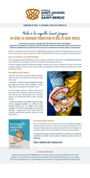 Un mois après l'ouverture, la campagne 2025-2026 affiche des résultats encourageants. Le gisement de la coquille Saint-Jacques de la baie de Saint-Brieuc confirme sa bonne santé et illustre une fois encore la solidité d'un modèle fondé sur la préservation de la ressource et la valorisation du travail des pêcheurs costarmoricains.