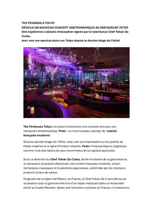 Sous la direction du chef Yohan Da Costa, étoile montante de la gastronomie, le restaurant proposera désormais une cuisine française moderne, alliant techniques classiques et inspirations japonaises, sublimées par les meilleurs produits locaux de saison.