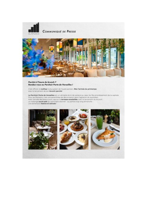 Restauration commerciale 07 mai 2024 - 10:15 Le rooftop le plus green de l'ouest parisien fête l'arrivée du printemps avec le lancement de son brunch perché. PDF (661 Ko) Télécharger