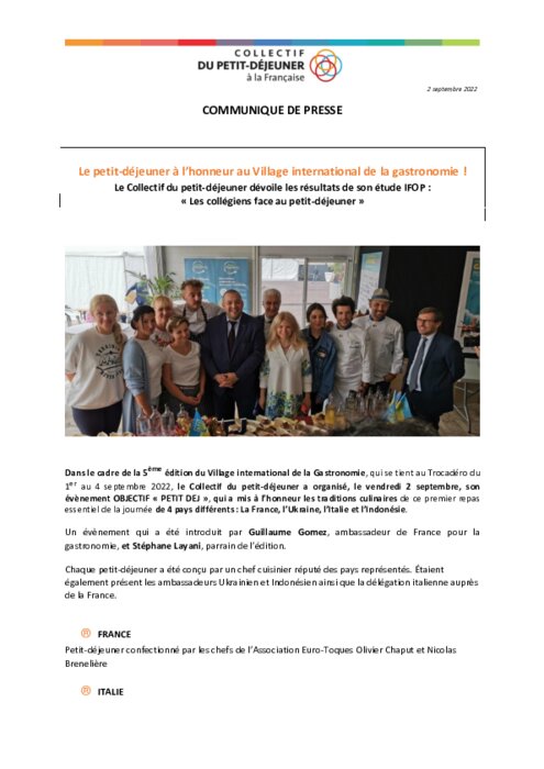 Dans le cadre de la 5ème édition du Village international de la Gastronomie, qui se tient au Trocadéro du 1er au 4 septembre 2022, le Collectif du petit-déjeuner a organisé, le vendredi 2 septembre, son évènement OBJECTIF « PETIT DEJ », qui a mis à l’honneur les traditions culinaires de ce premier repas essentiel de la journée de 4 pays différents : La France, l’Ukraine, l’Italie et l’Indonésie.