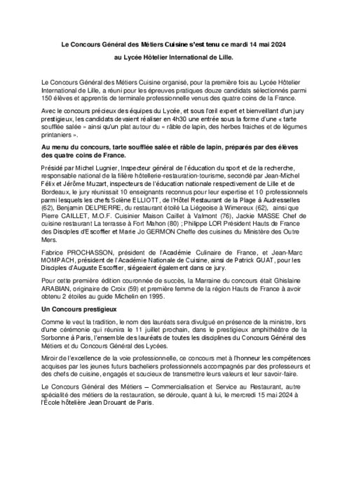 Le Concours Général des Métiers Cuisine organisé, pour la première fois au Lycée Hôtelier International de Lille, a réuni pour les épreuves pratiques douze candidats sélectionnés parmi 150 élèves et apprentis de terminale professionnelle venus des quatre coins de la France.