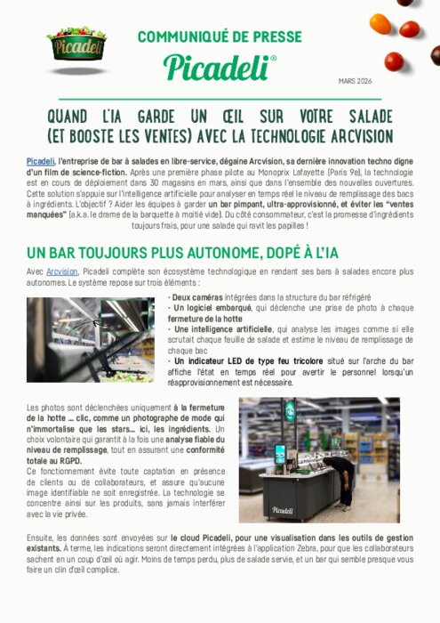 Picadeli, l’entreprise de bar à salades en libre-service, dégaine Arcvision, sa dernière innovation techno digne d’un film de science-fiction. Après une première phase pilote au Monoprix Lafayette (Paris 9e), la technologie est en cours de déploiement dans 30 magasins en mars, ainsi que dans l’ensemble des nouvelles ouvertures. Cette solution s’appuie sur l’intelligence artificielle pour analyser en temps réel le niveau de remplissage des bacs à ingrédients. L’objectif ? Aider les équipes à garder un bar pimpant, ultra-approvisionné, et éviter les “ventes manquées” (a.k.a. le drame de la barquette à moitié vide). Du côté consommateur, c’est la promesse d’ingrédients toujours frais, pour une salade qui ravit les papilles !