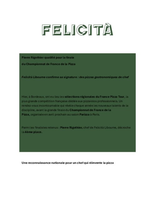 Pour les qualifications régionales, Pierre a concouru avec La Barbabietola, une pizza actuellement à la carte des Pizze Signatures chez Felicità Libourne. Dans sa version carte, elle associe une base de betterave à une crème de gorgonzola, de la 'nduja (saucisse de porc épicée fabriquée en Italie) et des noix, une composition gourmande et colorée qui reflète le travail de saison du chef.