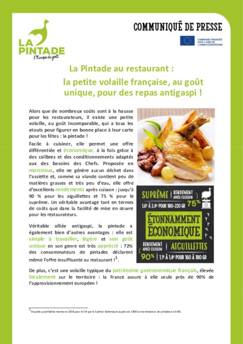 Fournisseurs 27 octobre 2022 - 16:51 Alors que de nombreux coûts sont à la hausse pour les restaurateurs, il existe une petite volaille, au goût incomparable, qui a tous les atouts pour figurer en bonne place à leur carte pour les fêtes : la pintade. PDF (819 Ko) Télécharger