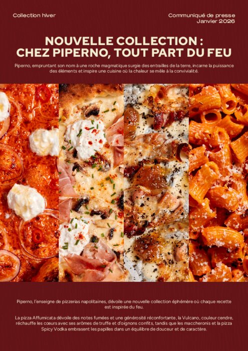 Piperno, l’enseigne de pizzerias napolitaines, dévoile une nouvelle collection éphémère où chaque recette est inspirée du feu. La pizza Affumicata dévoile des notes fumées et une générosité réconfortante, la Vulcano, couleur cendre, réchauffe les cœurs avec ses arômes de truffe et d’oignons confits, tandis que les maccheronis et la pizza Spicy Vodka embrasent les papilles dans un équilibre de douceur et de caractère. En édition limitée jusqu’au 22 mars .
