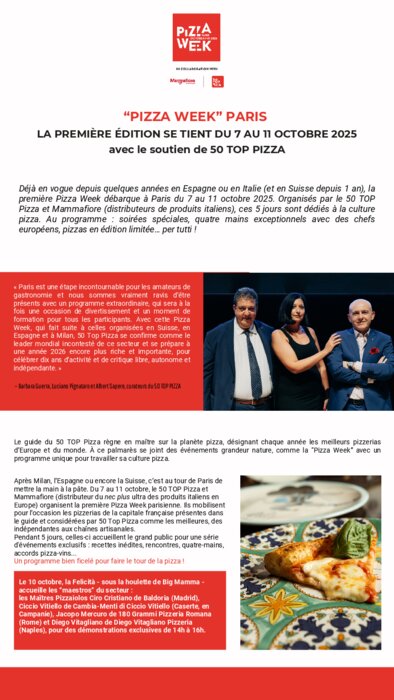 Déjà en vogue depuis quelques années en Espagne ou en Italie (et en Suisse depuis 1 an), la première Pizza Week débarque à Paris du 7 au 11 octobre. Organisés par le 50 TOP Pizza et Mammafiore, ces 5 jours sont dédiés à la culture pizza. Au programme : soirées spéciales, quatre mains exceptionnels avec des chefs européens, pizzas en édition limitée… per tutti !