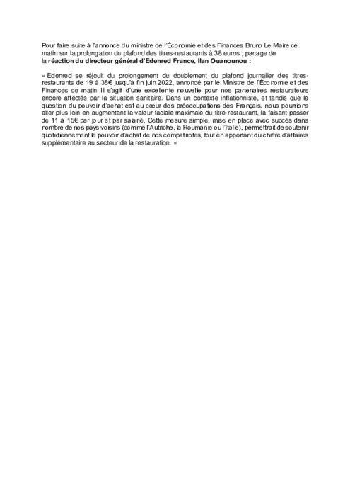 Métiers 23 février 2022 - 16:49 Edenred se réjouit du prolongement du doublement du plafond journalier des titres-restaurants de 19 à 38€ jusqu’à fin juin 2022 PDF (101 Ko) Télécharger