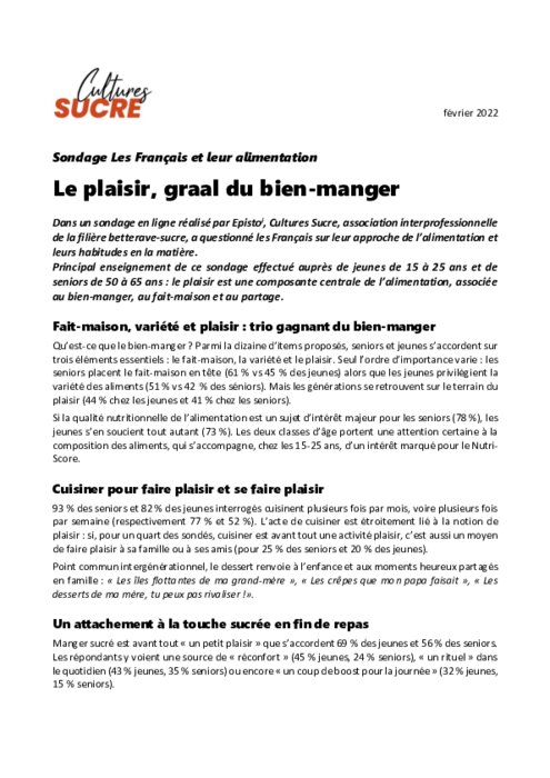 Dans un sondage en ligne réalisé par Epistoi, Cultures Sucre, association interprofessionnelle de la filière betterave-sucre, a questionné les Français sur leur approche de l’alimentation et leurs habitudes en la matière. Principal enseignement de ce sondage effectué auprès de jeunes de 15 à 25 ans et de seniors de 50 à 65 ans : le plaisir est une composante centrale de l’alimentation, associée au bien-manger, au fait-maison et au partage.