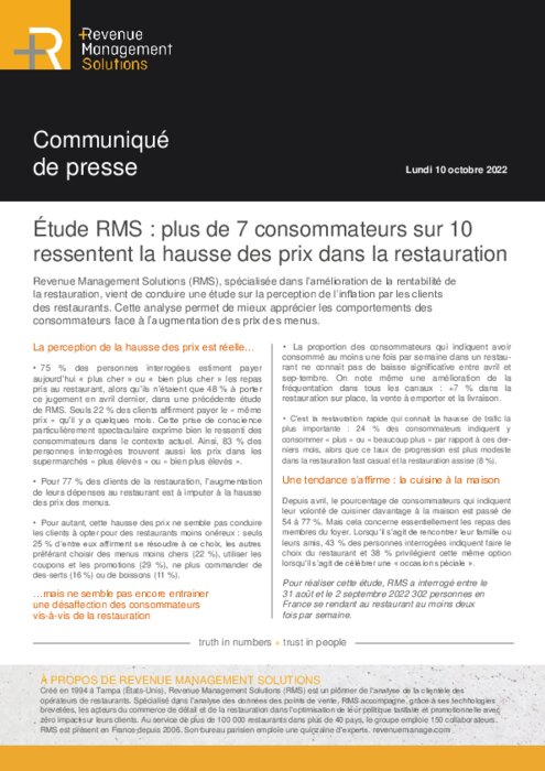 Revenue Management Solutions (RMS), spécialisée dans l’amélioration de la rentabilité de la restauration, vient de conduire une étude sur la perception de l’inflation par les clients des restaurants. Cette analyse permet de mieux apprécier les comportements des consommateurs face à l’augmentation des prix des menus.