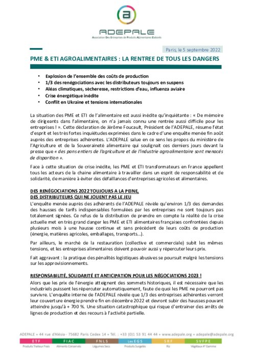 Face à cette situation de crise inédite, les PME et ETI transformateurs en France appellent tous les acteurs de la chaine alimentaire à travailler dans un esprit de responsabilité et de solidarité, de manière à éviter des défaillances d’entreprises agricoles et alimentaires.
