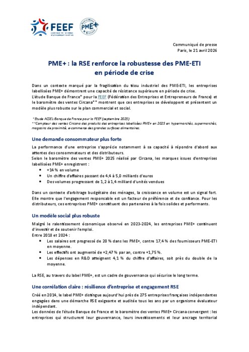 Dans un contexte marqué par la fragilisation du tissu industriel des PME-ETI, les entreprises labellisées PME+ démontrent une capacité de résistance supérieure en période de crise. L’étude Banque de France pour la FEEF (Fédération des Entreprises et Entrepreneurs de France) et le baromètre des ventes Circana montrent que ces entreprises se développent et présentent un modèle plus robuste sur le plan commercial et social.