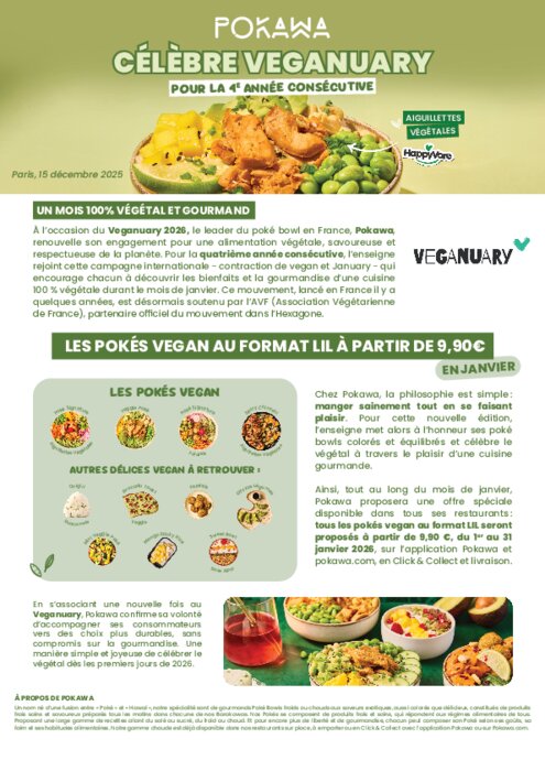 À l’image du Dry January, le Veganuary s’impose comme un rendez-vous annuel qui séduit un nombre croissant de consommateurs, curieux d’adopter de nouvelles habitudes alimentaires, plus saines, responsables et flexitariennes. Pour la 4ᵉ année consécutive, Pokawa, leader du poké bowl en France, accompagne ce mouvement de fond en rendant le végétal simple, accessible et gourmand. Tout au long du mois de janvier, l’enseigne propose une offre dédiée sur l’ensemble de ses recettes vegan, disponibles dans tous ses restaurants.