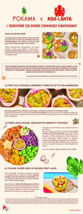 Le leader de la healthy food, Pokawa est fier de s’associer à l’une des émissions les plus emblématiques de France, reconnue par plus de 94 % des Français : Koh-Lanta. Cette collaboration d’exception unit deux univers autour de valeurs communes : aventure, goût et fraîcheur pour des recettes qui éveillent les papilles et offrent un véritable voyage gustatif