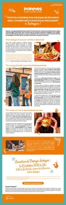 En juillet, Popeyes, l'enseigne spécialiste du poulet frit à la louisianaise, annonçait une première ouverture dans le Sud-Est de la France, à Plan de Campagne. Dans l'objectif d'atteindre les 250 restaurants d'ici à 2032, l'enseigne accélère son expansion et arrive à Aubagne le 23 octobre.