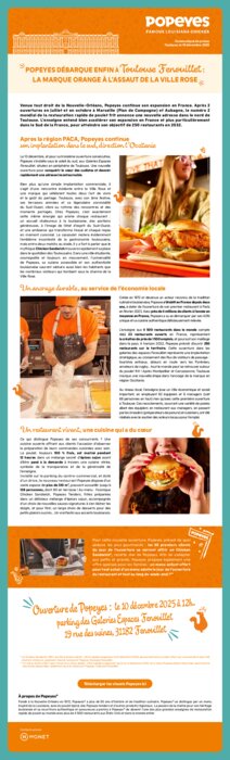 Venu tout droit de la Nouvelle-Orléans, Popeyes continue son expansion en France. Après 2 ouvertures en juillet et en octobre à Marseille (Plan de Campagne) et Aubagne, le numéro 2 mondial de la restauration rapide de poulet frit annonce une nouvelle adresse dans le nord de Toulouse. L’enseigne entend bien accélérer son expansion en France et plus particulièrement dans le Sud de la France, pour atteindre son objectif de 250 restaurants en 2032.