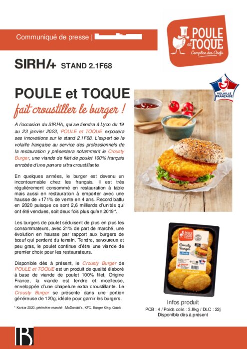 L'expert de la française au service des professionnels de la restauration y présentera notamment le Crousty Burger, une viande de filet de poulet 100% français enrobée d'une panure ultra croustillante.