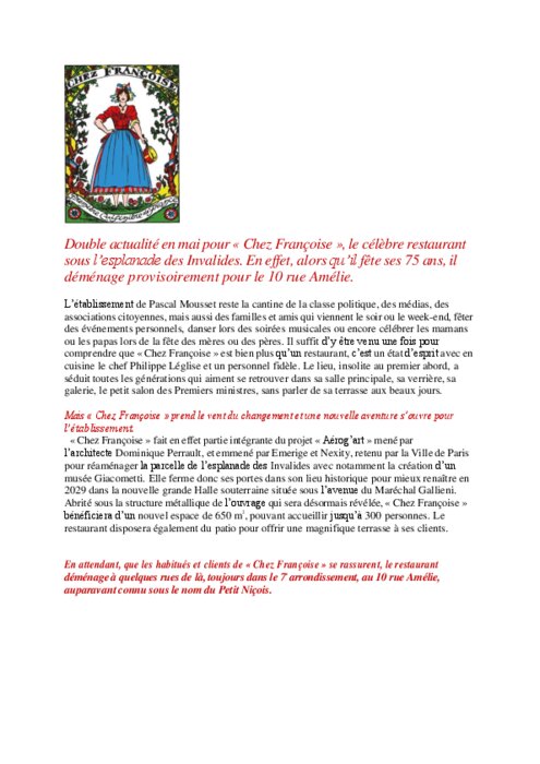 Pour ses 75 ans le restaurant Chez Françoise va déménager