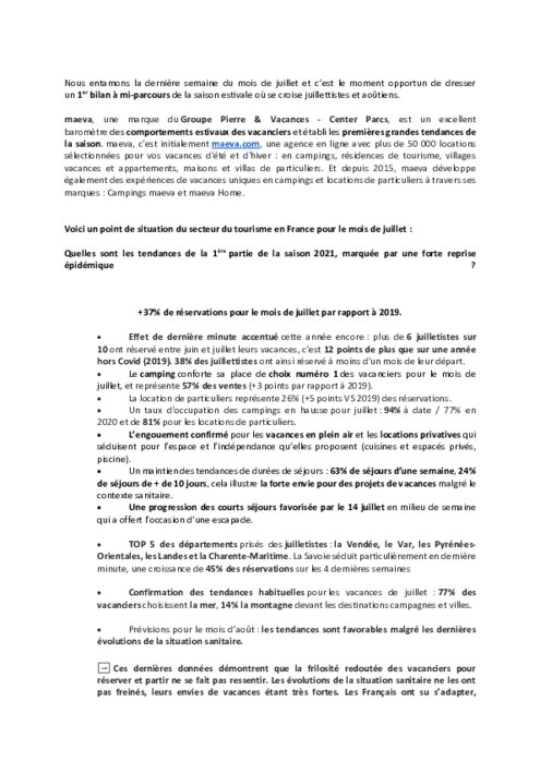 Métiers 26 juillet 2021 - 08:14 Maeva, une marque du Groupe Pierre & Vacances - Center Parcs, est un excellent baromètre des comportements estivaux des vacanciers et établi les premières grandes tendances de la saison. PDF (236 Ko) Télécharger