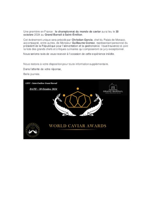 Une première en France : le championnat du monde de caviar aura lieu le 30 octobre au Grand Barrail à Saint-Émilion. Cet événement unique sera présidé par Christian Garcia, chef du Palais de Monaco, accompagné, entre autres, de Monsieur Guillaume Gomez, représentant personnel du président de la République pour l’alimentation et la gastronomie.
