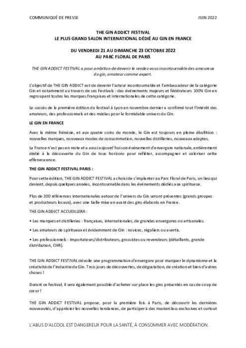 L’objectif de THE GIN ADDICT est de devenir l’acteur incontournable et l’ambassadeur de la catégorie Gin et notamment au travers de ses Festivals : des événements majeurs et fédérateurs 100% Gin en regroupant toutes les marques françaises et internationales de cette catégorie.