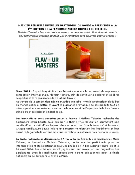 Expert du goût, Mathieu Teisseire annonce le lancement de sa première compétition internationale, Flavour Masters, afin de continuer à explorer et célébrer l’expertise et la connaissance de de la true flavour. Au travers de la compétition inédite, Mathieu Teisseire invite les professionnels du bar du monde entier à mettre en avant la puissance aromatique de ses produits tout en développant leur connaissance autour de la science et de l’expertise de la true flavour afin de créer des boissons inoubliables.