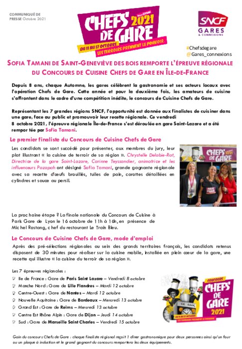 Depuis 8 ans, chaque Automne, les gares célèbrent la gastronomie et ses acteurs locaux avec l’opération Chefs de Gare. Cette année et pour la deuxième fois, les amateurs de cuisine s’affrontent dans le cadre d’une compétition inédite, le concours de Cuisine Chefs de Gare.