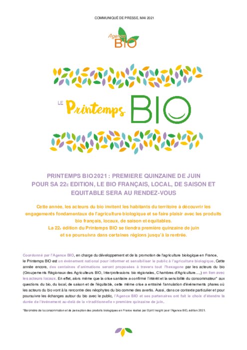 Métiers 28 mai 2021 - 16:44 Printemps bio 2021 : première quinzaine de juin. Pour sa 22ème édition, le bio français, local, de saison et équitable sera au rendez vous PDF (254 Ko) Télécharger