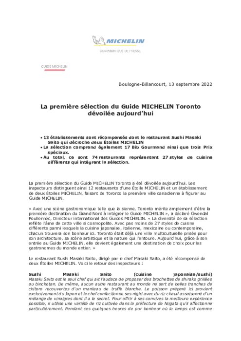Métiers 14 septembre 2022 - 09:34 Les inspecteurs distinguent ainsi 12 restaurants d'une Étoile MICHELIN et un établissement de deux Étoiles MICHELIN, faisant de Toronto la première ville canadienne à figurer au Guide MICHELIN. PDF (279 Ko) Télécharger