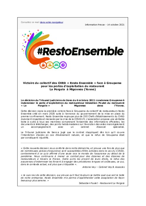 La décision du Tribunal judiciaire de Sens du 6 octobre 2021 condamne Groupama à indemniser la perte d’exploitation du restaurateur Sébastien Poulet du restaurant « La Pergola » à Migennes dans l’Yonne.