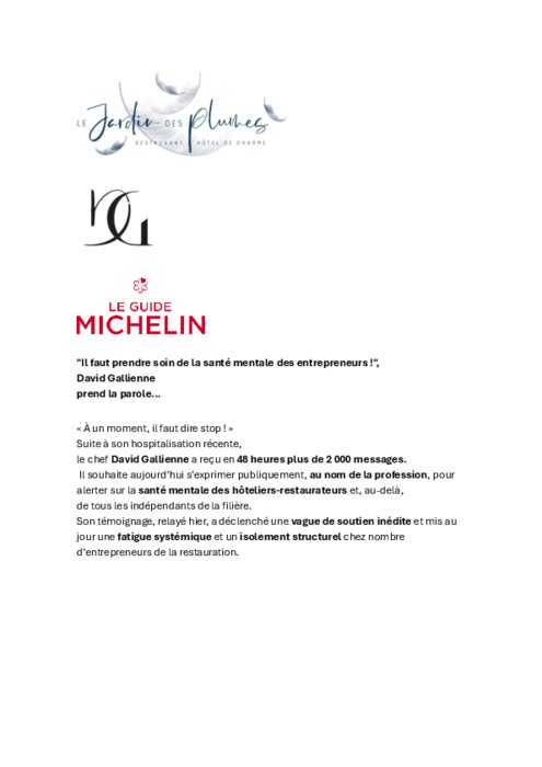 Suite à son hospitalisation récente, le chef David Gallienne a reçu en 48 heures plus de 2 000 messages. Il souhaite aujourd’hui s’exprimer publiquement, au nom de la profession, pour alerter sur la santé mentale des hôteliers-restaurateurs et, au-delà, de tous les indépendants de la filière.
