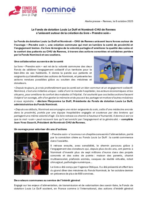 Le Fonds de dotation Louis Le Duff et Nominoë – CHU de Rennes unissent leurs forces autour de l’ouvrage « Prendre soin », une création commune qui met en lumière la santé de proximité et l’engagement breton. Ce livre témoigne de la volonté partagée d’améliorer la qualité des soins et le confort des patients au CHU de Rennes, à travers des actions concrètes et solidaires portées par le Fonds Nominoë et ses soutiens.
