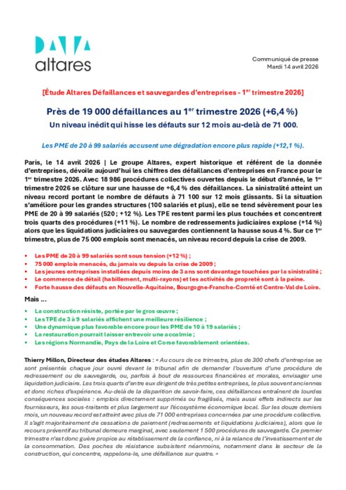 Le groupe Altares, expert historique et référent de la donnée d’entreprises, dévoile aujourd’hui les chiffres des défaillances d’entreprises en France pour le 1er trimestre 2026. Avec 18 986 procédures collectives ouvertes depuis le début d’année, le 1er trimestre 2026 se clôture sur une hausse de +6,4 % des défaillances. La sinistralité atteint un niveau record portant le nombre de défauts à 71 100 sur 12 mois glissants. Si la situation s’améliore pour les grandes structures (100 salariés et plus), elle se tend sévèrement pour les PME de 20 à 99 salariés (520 ; +12 %). Les TPE restent parmi les plus touchées et concentrent trois quarts des procédures (+11 %). Le nombre de redressements judiciaires explose (+14 %) alors que les liquidations judiciaires ou sauvegardes contiennent la hausse sous 4 %. Sur ce 1er trimestre, plus de 75 000 emplois sont menacés, un niveau record depuis la crise de 2009.